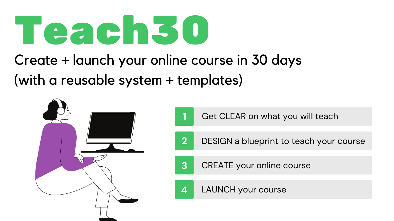 Teach30 will help you create + launch your course in 30 days with the support of a cohort